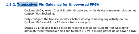 Hello, I would like to confirm the voltages allowed on the Agilex 7 F series Transceiver I/O (the Transceiver Data lanes and the REF_CLK inputs) during power-up or when the Agilex and its transceivers tiles are not powered. For example, I'd like to know if a scenario where Agilex interfaces to an external PCIe host that may drive PCIe clock to the Agilex Transceiver REF_CLK input before it's powered/while it's powering up is acceptable. The requirements for the Agilex GPIO, HPS_IO, and SDM_IO during powerup/when unpowered are clear to me from below documents but not the Transceiver I/O. I don't see any constraints specified for the Transceiver I/O during powerup unless I'm missing it. Can you please confirm this for me, or point me to where this is documented? If it matters, I am interested specifically in F-tile. The A692 Power Sequencing Considerations app note states the below: So it's clear for Cyclone GX, Arria 10, and Stratix 10 L/H tiles that no activity is allowed (with exception of 1.0 Vp-p on Stratix 10) on transceiver I/O during power-up but Agilex is not mentioned in this section. The Agilex 7 General-Purpose I/O User Guide states the following: Table 3: GPIO pin voltage must not exceed VCCIO_PIO or 1.2V, whichever is lower Table 22: HPS I/O pin voltage must not exceed VCCIO_HPS. Table 29: SDM I/O pin voltage must not exceed VCCIO_SDM. I don't see any mention of similar constraint for Transceiver I/O. The Agilex 7 Power Management User Guide states the following: Again, I see all I/O other than Transceiver I/O mentioned. Thanks!27Views0likes5CommentsLTC Connector DE10-Standard FPGA
