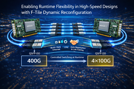 This post demonstrates how F-Tile Dynamic Reconfiguration in Agilex 7 FPGAs enables real-time switching between 400G and 4×100G Ethernet without system downtime. It explains how predefined configuration profiles, system-level data path reconfiguration (MAC, PCS, FEC, PMA), and software control enable predictable, production-ready transitions. The article also highlights support for multi-rate Ethernet, protocol flexibility, and continuous traffic validation, showing how FPGA-based systems can adapt dynamically to changing network conditions.