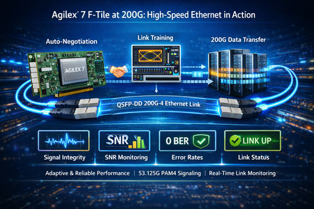 This post demonstrates a 200G-4 Ethernet link running on Agilex 7 FPGAs using F-Tile transceivers. It walks through the full link bring-up process, including Auto-Negotiation and Link Training, followed by stable high-speed data transmission using 53.125G PAM4 lanes over QSFP-DD. The demo provides real-time visibility into link status, signal integrity, and error metrics, and evaluates performance across loopback configurations and varying cable lengths. The result highlights reliable link initialization, consistent throughput, and robust operation under practical system conditions.