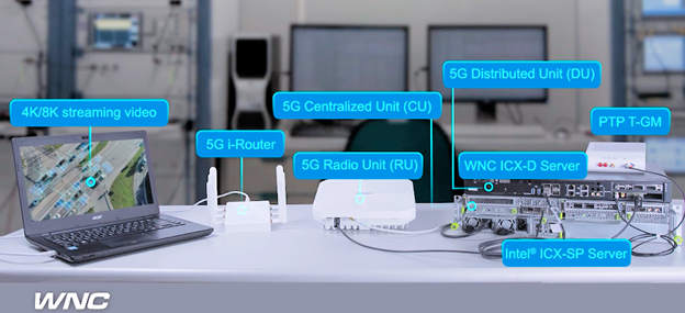 WNC’s 5G End-to-End Demo streams 4K video over several pieces of O-RAN equipment developed by WNC including an O-RU (Open Radio Unit) and an O-DU (Open distributed Unit), and O-CU (Open Centralized Unit) plugged into a COTS server based on an Intel® Xeon®-D (Ice Lake-D) CPU.