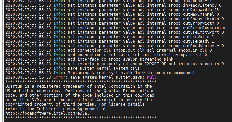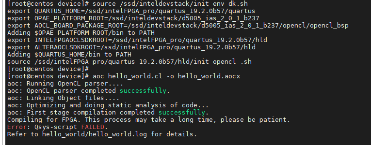 We used the user guide(Intel Acceleration Stack Quick Start Guide -- Intel FPGA Programmable Acceleration Card D5005-ug-qs-ias-d5005.pdf) and the Installation package(d5005_pac_ias_2_0_1_pv_dev_installer.tar.gz) to install the build environment.But when we completed the installation and Running the Hello FPGA Example,is reported errors.Is it any wrong during installation causing this compile error?