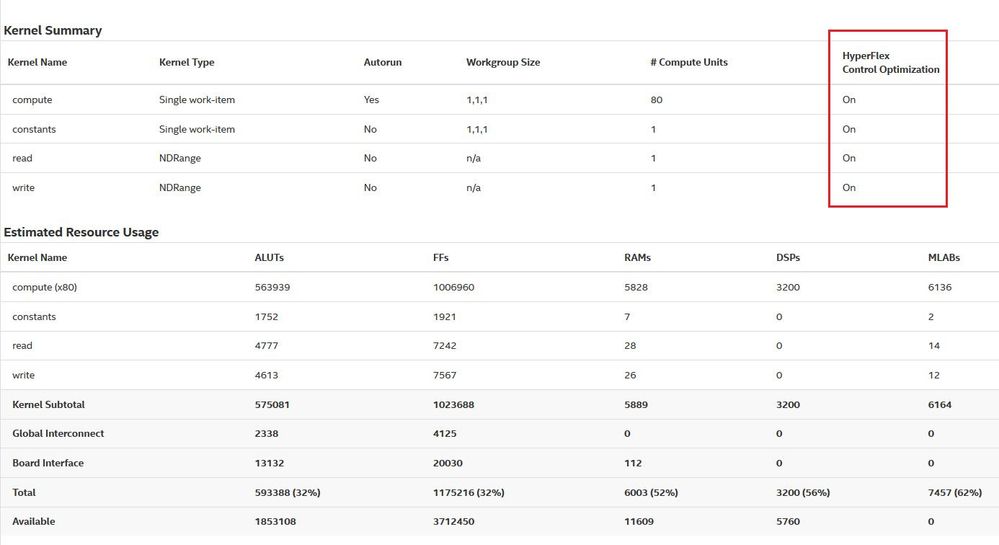 How can I disable the Hyperflex optimization that is performed automatically by the OpenCL compiler on Stratix 10 in the v18.1.2 of the compiler? The v19.x versions of the compiler add the -hyper-optimized-handshaking option to disable this optimization; however, this option is not available on v18.1.2. Since my board's BSP is compatible with v18.1.2, I have to use that version. The Hyperflex optimization is impractical in my design due to its HUGE area overhead: 20% extra logic, 30% extra Block RAM compared to version with hyperflex optimization forcibly disabled by inferring burst non-aligned memory ports instead of aligned. I obviously want to use the version of my design with aligned memory ports due to higher memory performance and lower area overhead.