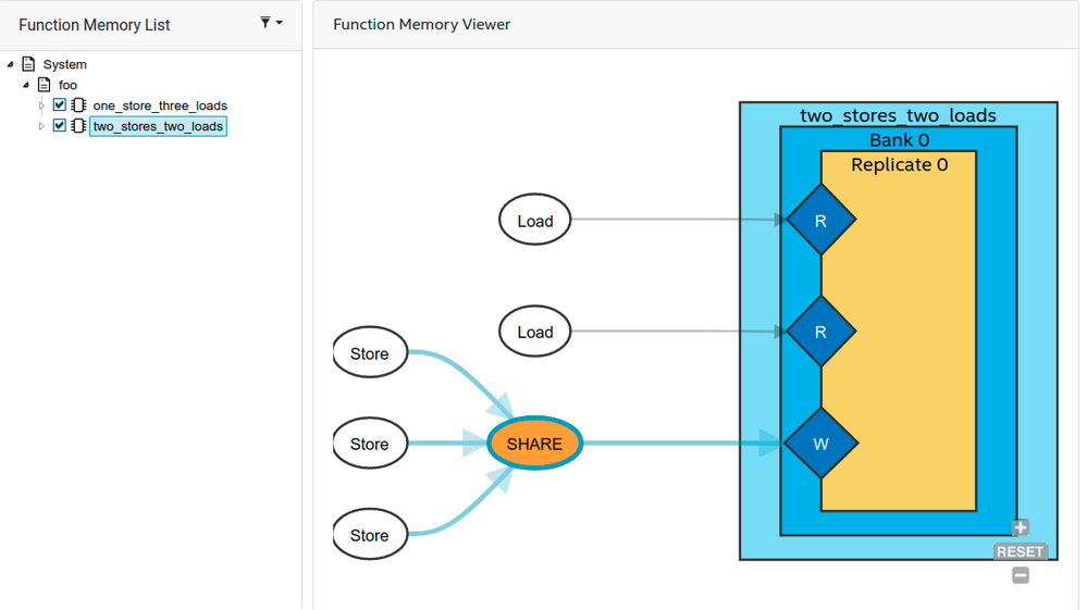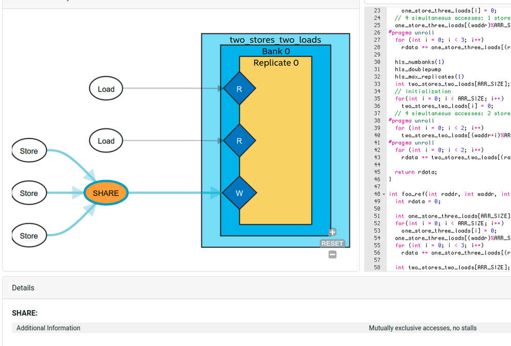 According to what I understand, this should generate single memory bank with two store ports and two load ports. However, when opening the synthesis report, memory view shows as below: