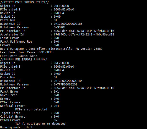 Could you please share the output of correctable/uncorrectable status "before" and "after" run the fpgabist nlb_mode_3.gbs test? How many boards encounter this error? Do you try to program the flash again, and re-install the DCP 1_2 stack?