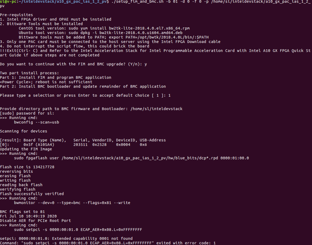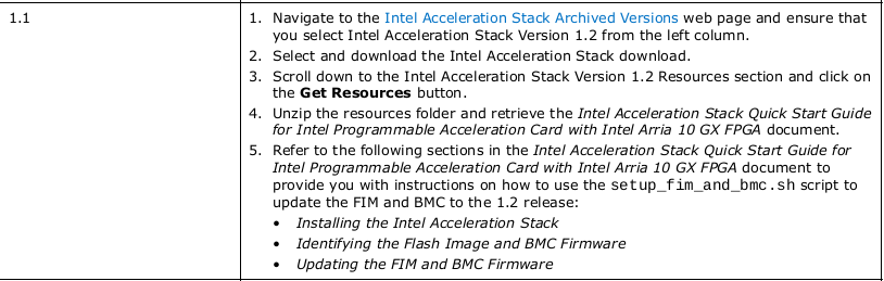 Note: • It is acceptable to leverage the 1.2 OPAE packages when following the FIM update instructions from the 1.1PV version of the Intel Acceleration Stack Quick Start Guide for Intel Programmable Acceleration Card with Intel Arria 10 GX FPGA.