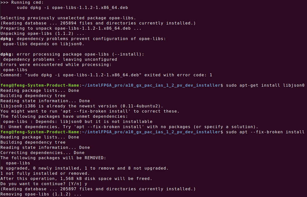 I was installing OPAE on host machine, my PC, for Intel Programmable Acceleration Card with Intel Arria 10 GX FPGA and encounted the attached problem when ruuning the following command