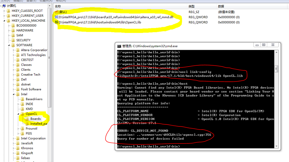 I am attempting to compile and run the hello world design example on Windows 7 with Visual Studio 2010. I have AOCL and Quartus installed and the environment configured according to the quick start guide.
