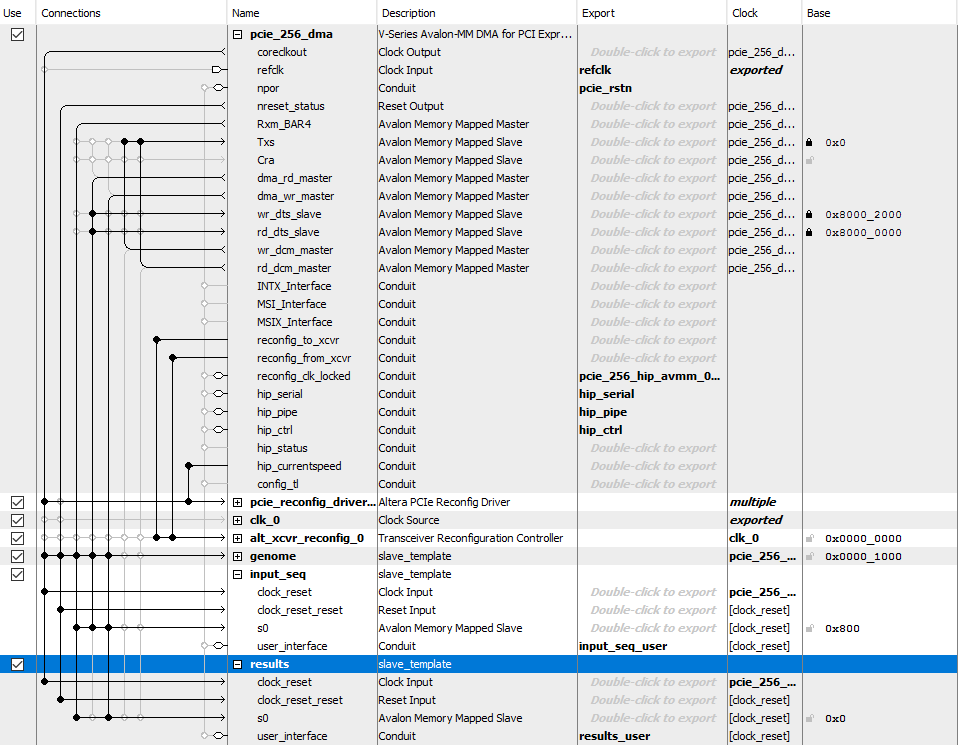 (1)Use instances of the avalon slave template in the platform designer, connect them to the PCIE DMA, and export the user signals to FIFOs inside my verilog modes.