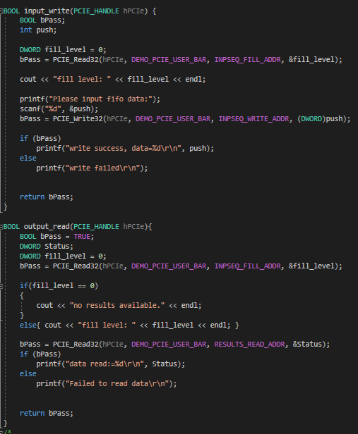 I am trying to transfer data from a PC to a FIFO on the FPGA. I am using PCIE DMA for the transfer. That data is then used in calculations, and the results are stored in another FIFO that then has to be read form the PC. I am experimenting with several setups but none of them have worked so far: