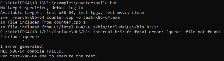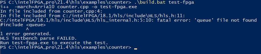 After running the init_hls.bat I thought I am ready to run one of the first examples. So I picked the 'counter' project provided in the <quartus install dir>\hls\examples\counter folder. But when running the build.bat file I always encounter the following error: