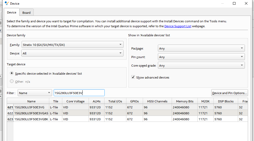 I have also tried with Quartus Prime Pro 21.2 version, but I am not able to find the 1SG280LU3F50E3VGS1 device in the device list.