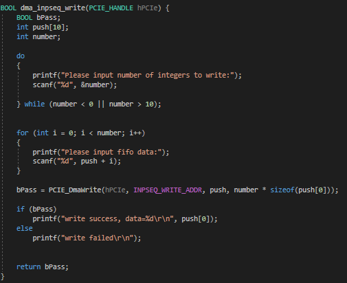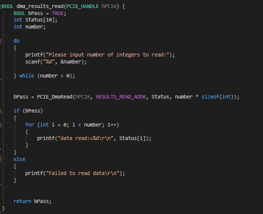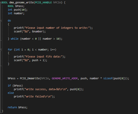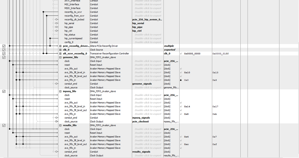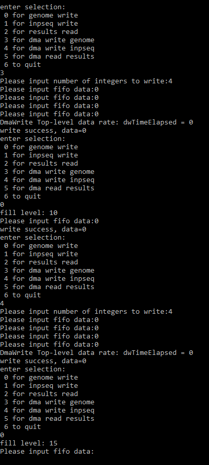 When i use the DMA functions to write to the two FIFOs, The write operation works, but it always writes to the same FIFO and not the other, regardless of which address I use in the argument of PCIE_DmaWrite(). It seems to always be writing to the FIFO with input adress 0x0. The dma read operation works without problems, though I only have one read-FIFO anyway. When I tried manually setting the base adresses so that neither of the write-FIFOS had base address 0x0, the C program crashes shortly after producing some false results, and then the PCIE_Open() will alwys return false.