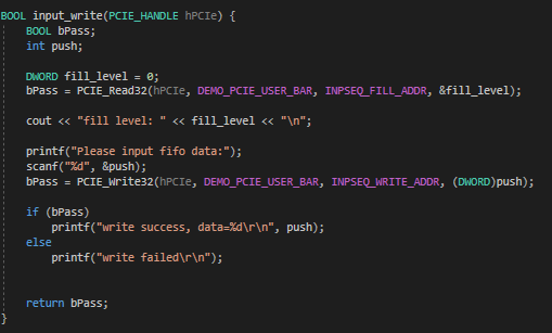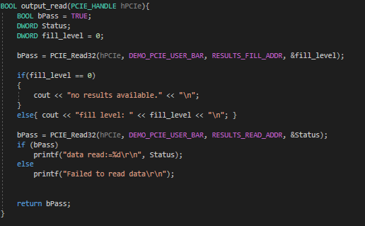 I am trying to transfer data between FIFOs on an FPGA and a C++ program running on a PC. I am using the PCIE example design from the DE5-net CD demos as a basis for my own. I have two FIFOs I am writing to and one I am reading from. I created an Avalon salve interface for communication with the FIFOs. On the PC side I am using the 4 functions PCIE_Read/Write32() and PCIE_DmaRead/Write() from the demo.