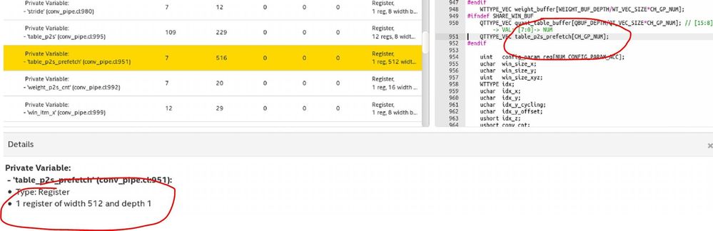 The variable table_p2s_prefechtor is actually 16-bit width (unsigned short), but the compiler make it 512-bit wide, this makes feedback logics in-efficient.
