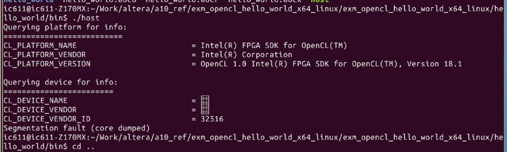 I am currently using an a10 reference board, and I have recently upgraded to v18.1.0. I recompiled the official helloword example, and found out the host program crashed like follows,