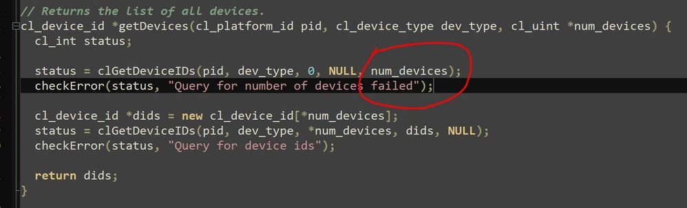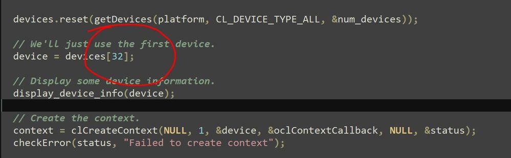 Therefore, in the host program of the example, I changed the device num to 32 as follow