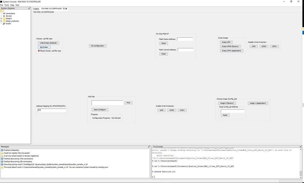 Then, I'll use system console(write the programmer using tcl scripts) to program the CFM0 portion in my MAX 10 device. Below are my tcl script GUI to program only certain portion of MAX address (program CFM0 area only)