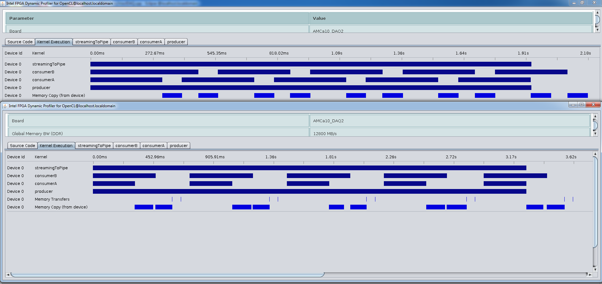 kernel 3 & 4: "ConsumerA" and "ConsumerB" when data is available they copy a fragment of the buffer requested by "producer" to a host allocated buffer.
