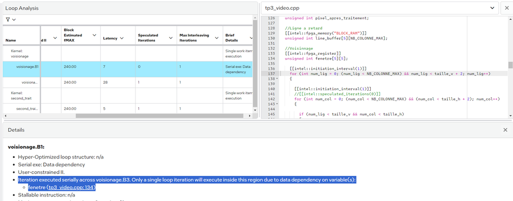 I also see that you are getting a memory system with lots of arbitration:After some experimenting, I discovered that the warning about the variable 'fenetre' is a bit of a red herring here. I would expect for a line buffer like you are describing to have a memory system with multiple banks, and each bank having a dedicated load/store unit (LSU). From the image above, we can see that the memory system is not efficiently selecting banks. I tried using the bank_bits attribute to constrain this, but it appears the compiler is ignoring this attribute now.