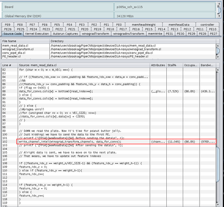 Then it sounds like the stalls are propagating from the bottom of the pipeline. I am afraid I have never profiled autorun kernels, so I cannot comment on the correctness of the way you are capturing the counters. However, I find it very unlikely for regular compute PEs or on-chip channel to become a performance bottleneck. As a test, you can remove all your PEs from the kernel, and just keep the memory read/write kernels directly connected to each other through a channel. If you get similar stalling on this simplified kernel, the problem is coming from memory. Note that if you are exhausting the external memory bandwidth, seeing such stalls on the channels is completely normal.