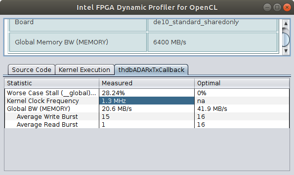 I'm working on an OpenCL kernel targeting a Cyclone V SoC that should process a continuous real-time sample stream at a sample rate of 16 MHz, which requires a certain kernel clock frequency so that the kernel can keep up with the data stream. Coming from traditional VHDL design flows, I'm quite certain that a clock frequency of approx. 40 MHz should not be an issue for the Cyclone V.
