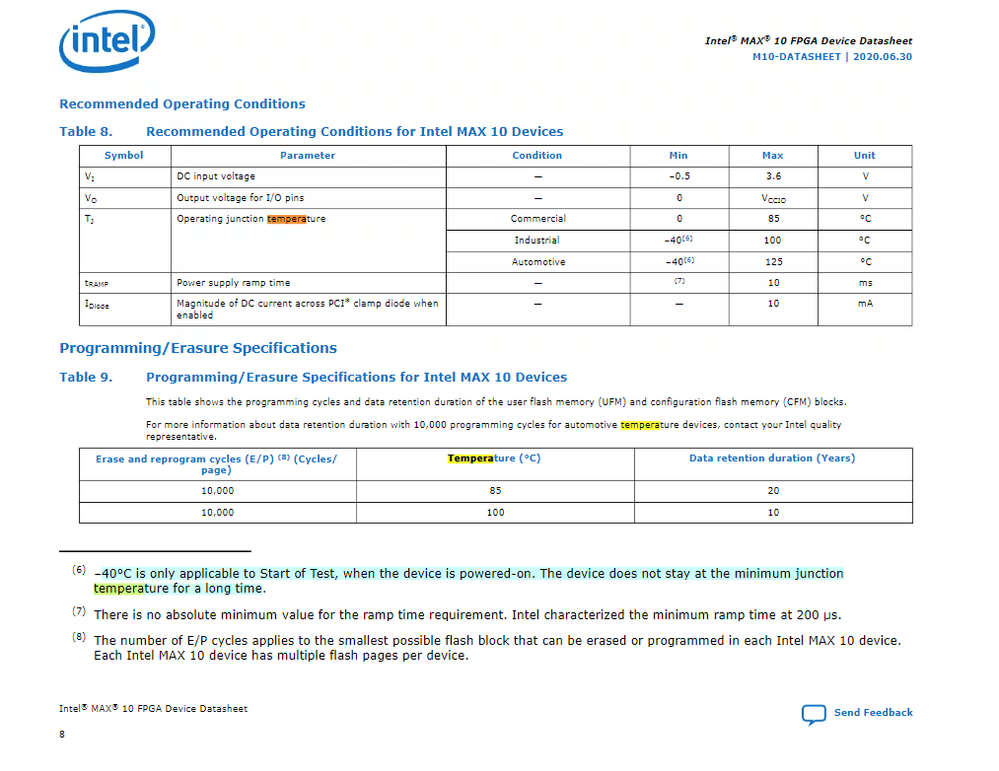 I'm from CYIENT. We are using 10M02SCE144C8G FPGA in our project. As per requirement the FPGA should sustained up to -40 °C. In the datasheet minimum junction temperature is given as -40 °C but with note: