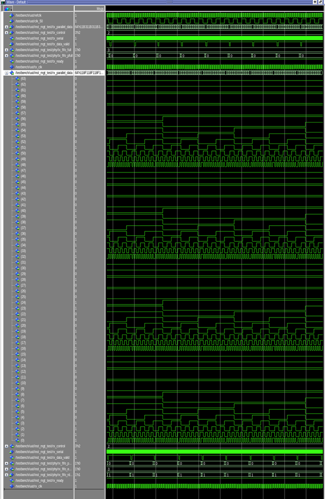 Unfortunately, the RX data has frequent 'glitches' where the data changes in an unexpected way for one clock tick. Meanwhile, the 'data_valid' and 'rx_ready' signals are fixed at '1'.