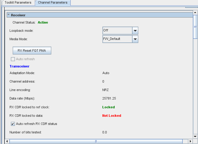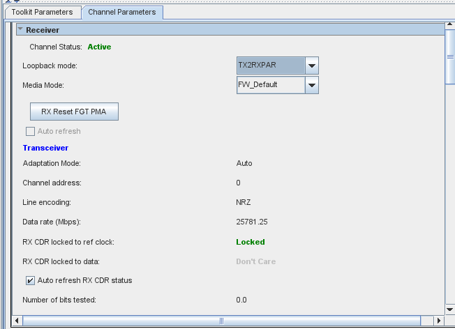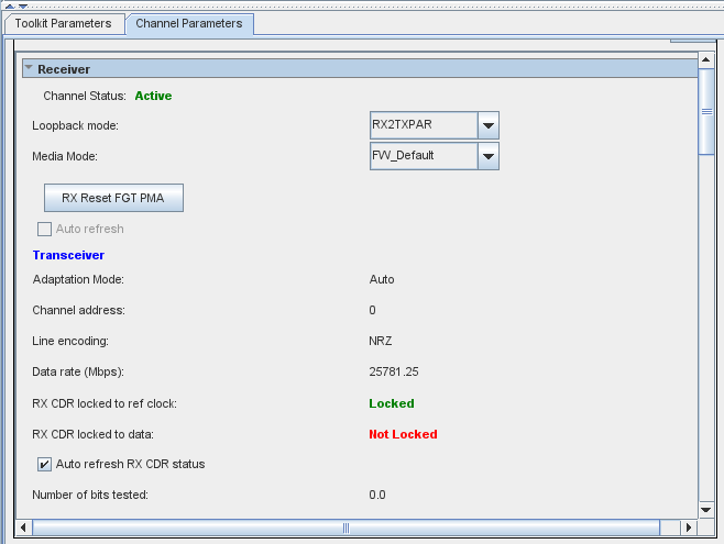 When using the F-Tile PMA/FEC Direct PHY Intel FPGA IP for PRBS testing, I am consistently unable to perform PRBS testing in external loopback mode due to the CDR not locked to data. Even when using Intel's IP core example design (FGT NRZ 50G 2PMA lanes RSFEC 528/514), I still cannot proceed with the test. The following images show the CDR status under different loopback modes, but I am unable to pinpoint where the issue lies.