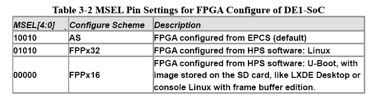 It seems that the FPGA image is not loaded after power up. I found following lines in the uboot bootlog: reading soc_system.rbf 7007184 bytes read in 2368 ms (2.8 MiB/s) altera_load: Failed with error code -4 My board switch and jumper settings are listed as below: SW1 All OFF SW2 All OFF SW3 1:ON 2:ON 3:ON 4:ON 5:ON 6:ON SW4 1:OFF 2:OFF 3:ON 4:ON J5 open J6 shorted J7 shorted J9 open J13 shorted J16 open J26 right shorted J27 right shorted J28 right shorted J29 right shorted J30 left shorted J31 shorted Please help
