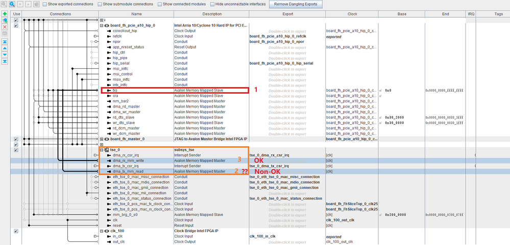 [BTW], we uses "AVMM-DMA" setting in our system. We made an experiment to change from "AVMM-DMA" to "AVMM w/o DMA" in PCIe HIP core, in this case both "mSGDMA writing" and mSGDMA reading works fine, that says the “~168 cycles delay" disappears, this maybe some clues for your expertised analysis.
