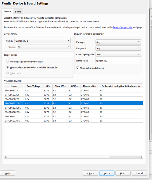 I recently bought a FPGA development board with the CYCLONE IV EP4CE6E22C8N I downloaded the Quartos Prime Lite Edition software with support for Cyclone IV but i can't seem to find the chip: EP4CE6E22C8N this causes problems on my board when i try to interface with the VGA Port, the board is RZ-EasyFPGA A2.2