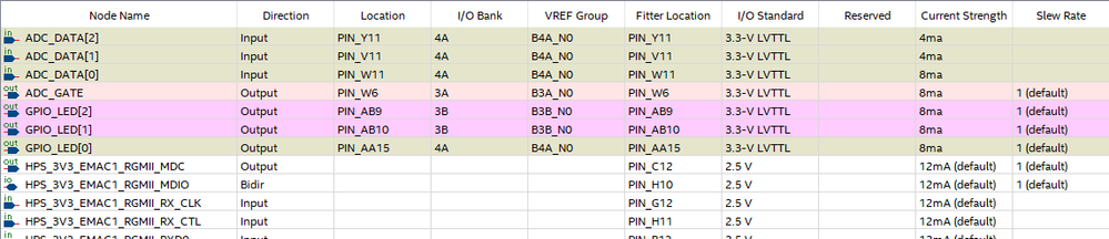 When I look at the "Pin Planner" after compiling, my custom FPGA pins were assigned manually, and a new "Fitter" column has the location of the HPS pins.