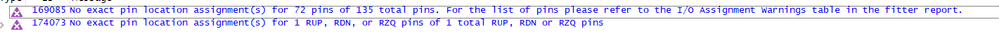 "ID:169085 No exact pin location assignment(s) for 72 pins of 135 total pins. For the list of pins please refer to the I/O Assignment Warnings table in the fitter report."