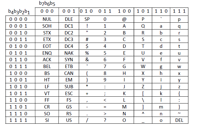 A tabela seguinte apresenta o código ASCII (7 bits - b7b6b5b4b3b2b1) utilizado em diversos computadores