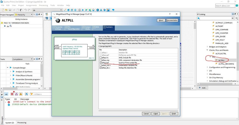 2) When invoking megafunctions, the DE0 user manual also refers to choosing VerilogHDL out of AHDL/VHDL/VerilogHDL , while Quartus 16.1 only offers VHDL/Verilog, so which option should I choose at this stage, to make the exercise work? (DE0 user manual, p56 section 4c)