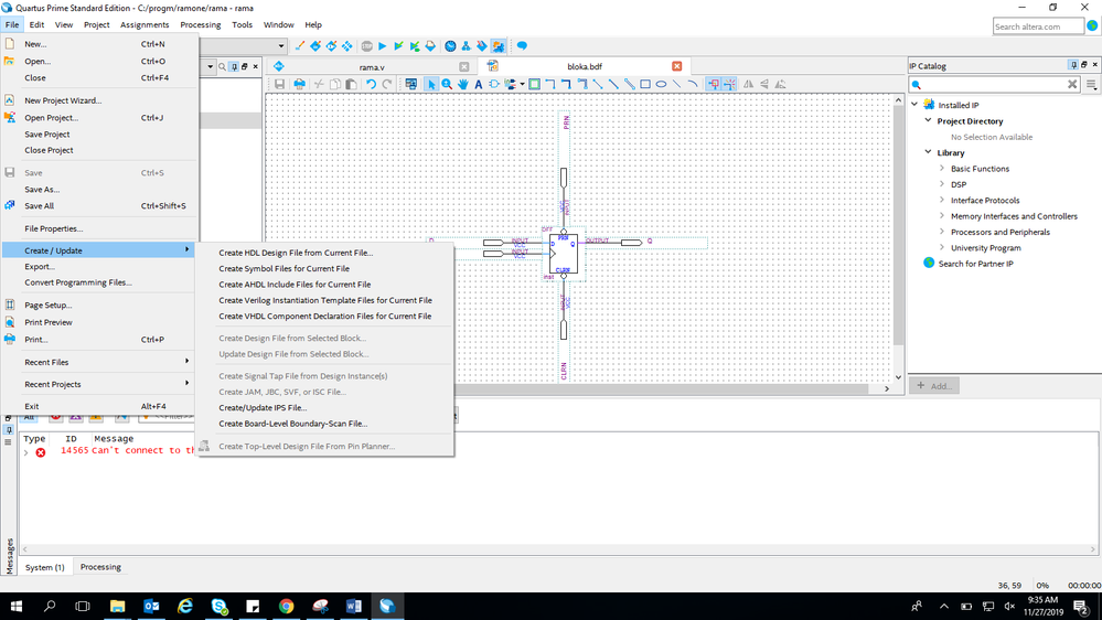 Good afternoon guys, I'm trying to create a schematic block file of the program I made, but the option appears as "disabled". I am using the Quartus Prime Pro Edition IDE, I have tried to generate this file for many different projects and this option is not always available. Does anyone know if anything needs to be enabled in the Quartus Prime settings? I used the same programs in Quartus II 13.0 and it worked. Apparently the problem is occurring when I use the prime version.