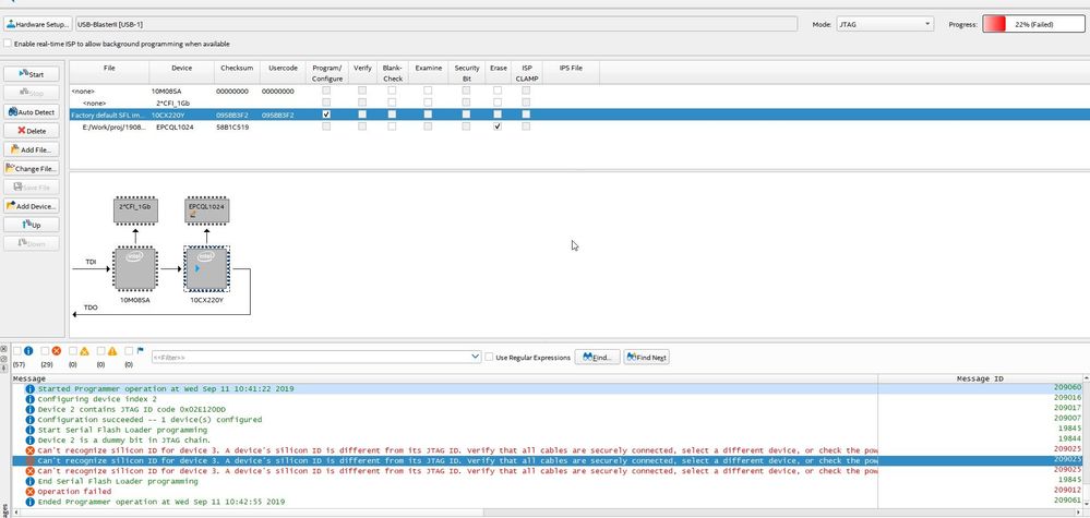 - Erasing the EPCQL1024 device is not possible. In the Programmer I select a .jic file for the 10CX220Y FPGA, so the EPCQL1024 device appears as one connected to the 10CX220Y. Then I check Program/Configure for the 10CX220Y and Erase for the EPCQL1024. Using a lower JTAG frequency the status indicator goes to 22% (using 24MHz it remains on 0%), then it fails. Using version 17.1 the message is "Operation failed". Using version 19.2 the message is "Error(209025): Can't recognize silicon ID for device 3. A device's silicon ID is different from its JTAG ID. Verify that all cables are securely connected, select a different device, or check the power on the target system. Make sure the device pins are connected and configured correctly. " (See screenshot.)