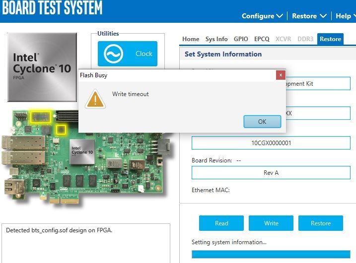 - Factory Restore from BTS is not working. In the Erase phase the status indicator does not move, Erase phase finishes in cca. 3 seconds, then during Writing the status indicator doesn't move either, and after a few seconds a window is popped up, saying "Write timeout". (See screenshot.)