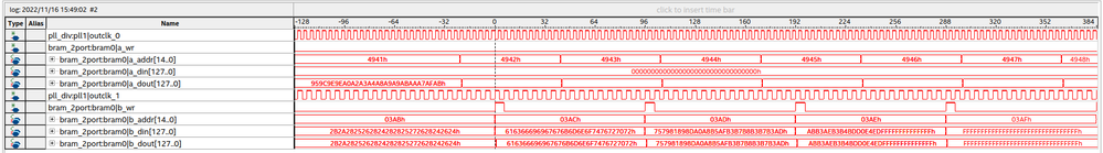 The SignalTap recording of the ports of the custom 2-port BRAM is in the next image: