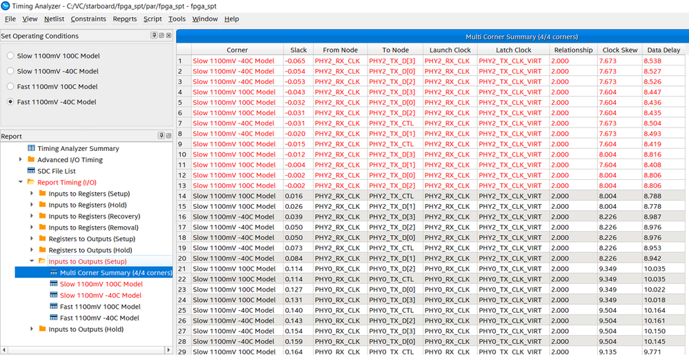 Trying synthesizing a TSE MAC with RX-Clock to TX-Clock loopback fails because of timing missmatch. Applying a 2ns delay at the PHY and with the constrains made, the FPGA has 600ps setup and 900ps hold time budget for TX-path. The worst failing path is from the back-looped RX-Clock Pin to one of the TX-Data output Pins with a mismatch of 360ps.