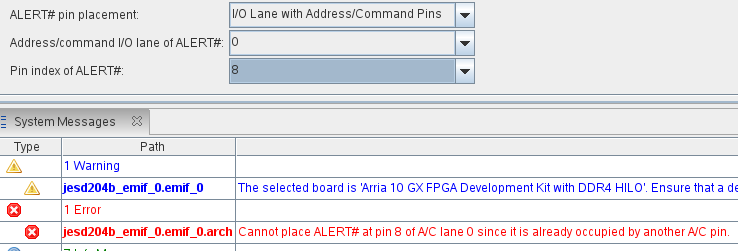 Error: emif_0.arch: Cannot place ALERT# at pin 8 of A/C lane 0 since it is already occupied by another A/C pin.