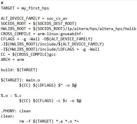 While following the "My First HPS" PDF tutorial from the Terrasic DE10-Nano page, I am having issues compiling the project. This step in the PDF is labelled as "2.4 Compiling the Project." When I use the make command inside of the embedded command shell, I get the message "make: Nothing to be done for '-IC'. I've attached the main.c and makefile screenshots in case someone can spot a mistake. This tutorial is years old at this time and it's likely there are different steps to take in order to perform the compilation with newer software. Anyone have ideas or know of an up to date tutorial for this development board?