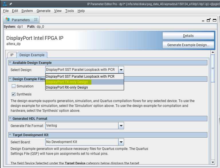 We suggest you to use the same Quartus software version as the project you downloaded or you may generate the Displayport TX-only design directly from IP catalog in Intel Quartus software version 21.4 onwards.