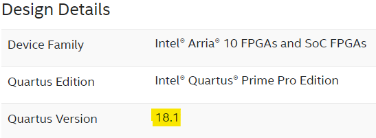 The reference design that is uploaded into Intel design store is a older version of Displayport TX-only design which is using Quartus version 18.1.