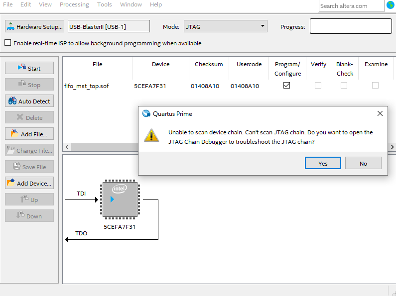 I tried using Quartus Prime and followed the 'Configuring the FPGA Using the Quartus II Programmer' section in the UG_CVE_FPGA_DEV_KIT document to program the C5E_DEV_KIT_B using JTAG. However, when I press 'Auto Detect,' I always get the message 'Unable to scan device chain. Can't scan JTAG chain.' Also, I do not plan to use MAXV. How can I resolve this issue or configure it correctly?