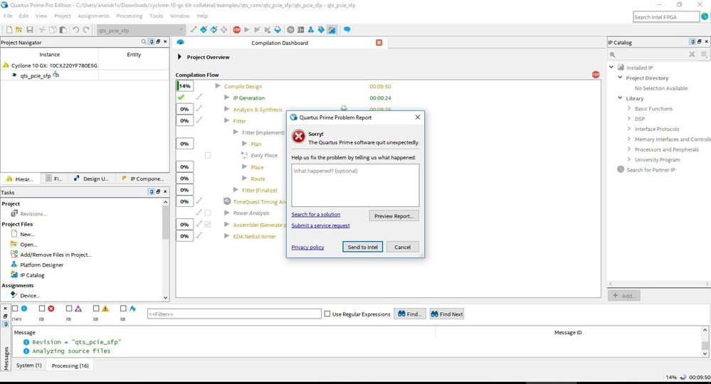 I have a Cyclone X GX FPGA development kit. I am trying to compile one of the example projects in Quartus (qts_pcie_sfp) but am getting an error (see below):