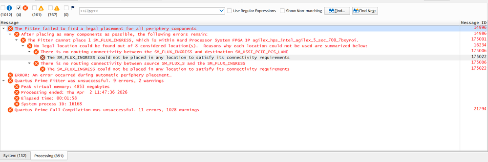 During compilation, I am encountering a fitter error when both PCIe and USB 3.1 are enabled together. However, I am able to compile successfully when using each interface individually.