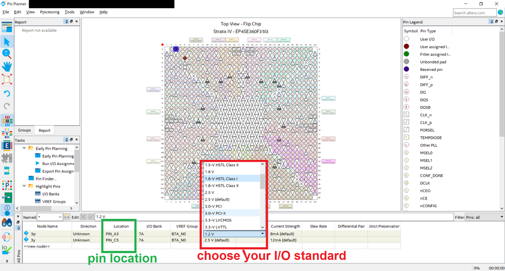 In Assignment Editor or Pin Planner, you can assign pin location, I/O standard, Current strength and etc.