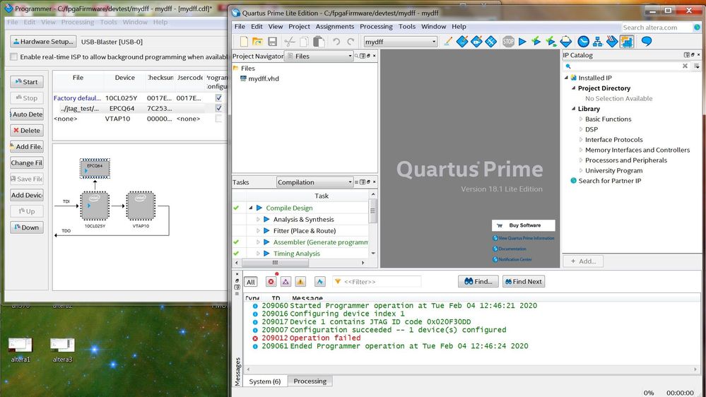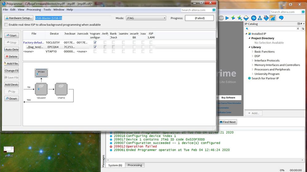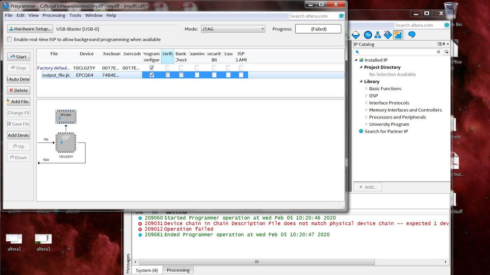 After connecting a USB Blaster to the dev board's JTAG connector and setting dip(4) to off, I added the flash-loader ip to my simple dff design. I synthesized everything and created a *jic file to the appropriate components for this dev board. Using the programmer set for USB BLASTER and the jic file loaded, the upload failed. I've added pictures to illustrate what occurred. I know my setup is correct because I programmed the dev board using the *sof file and not bothered with the flash loading stuff. I thought I followed everything in an370 correctly, but I'm missing something. Any help would be greatly appreciated.
