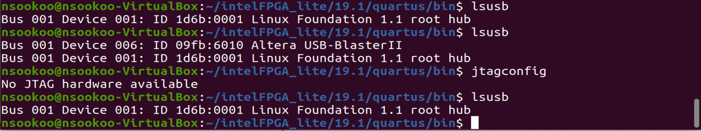 I'm currently trying to set up the USB Blaster II for a Max 10 10M08 Evaluation Kit using Ubuntu ran on Virtualbox. On terminal, it says that the USB blaster is connected (using lsusb). I've also created the file named usbblaster.rules. Not sure as to why it's not showing up as hardware in the programmer menu of Quartus Prime Lite when I try to add it. Any ideas or any thing I could do to make this work? Thank you.